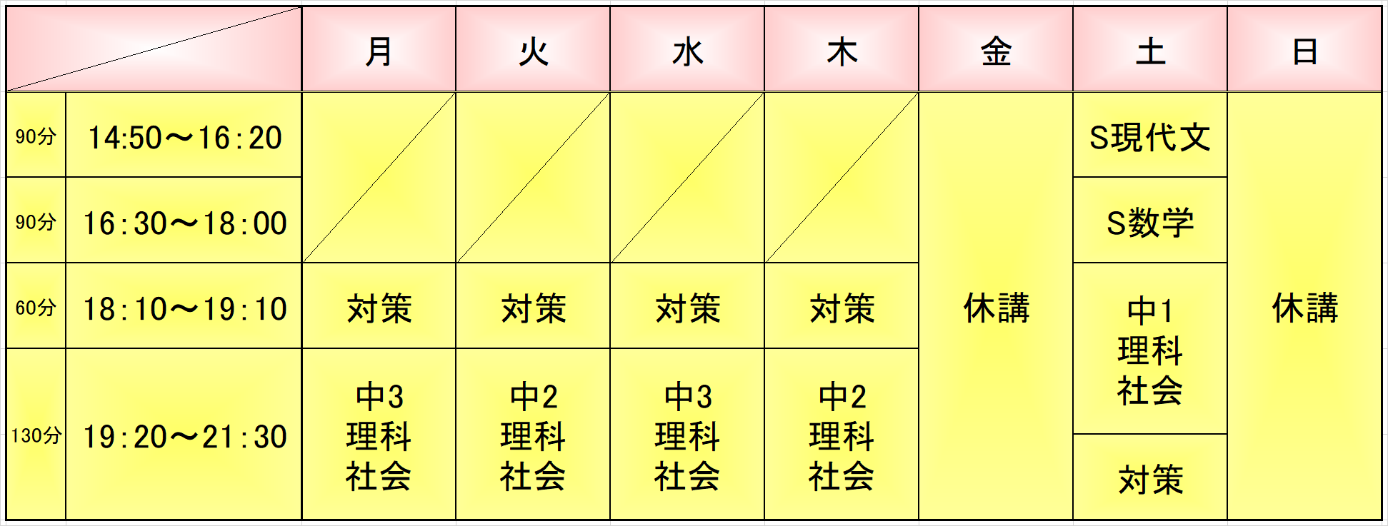 • 対策:定期テスト期間中に開講(無料)。中3秋学期は入試に向けた総復習授業として毎週開講。